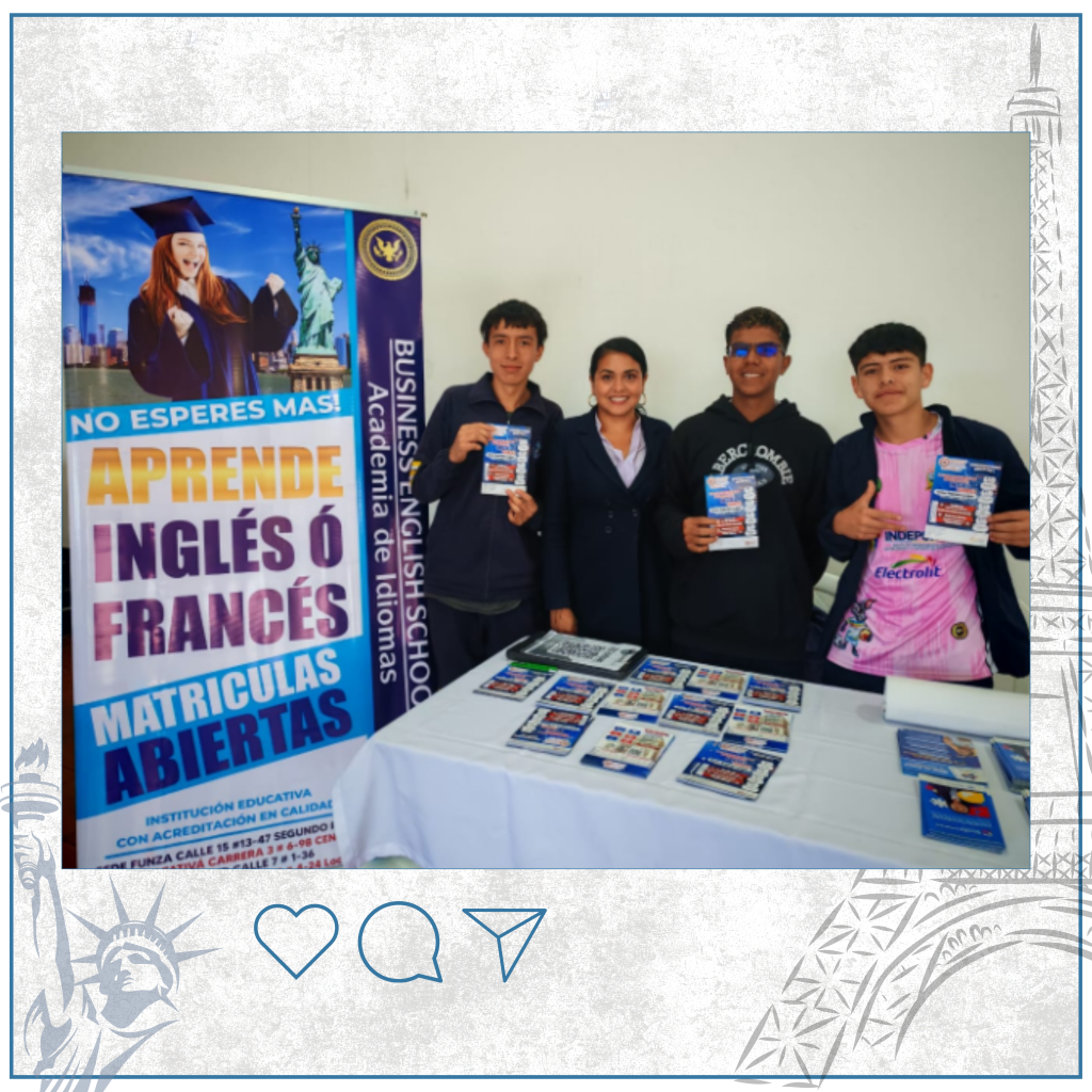 Business English School se hizo presente en la feria universitaria de Bojacá, ofreciendo a los estudiantes la oportunidad de conocer más sobre sus programas en inglés y francés. Durante el evento, resaltamos cómo el dominio de un segundo idioma puede ampliar el horizonte educativo y abrir puertas en el ámbito laboral, brindando una ventaja en el mundo actual. Fue un gusto ver el interés de los jóvenes, docentes y familias en las oportunidades de formación que ofrecemos. ¡Gracias a todos por acercarse y mostrar tanto entusiasmo por el aprendizaje de idiomas!